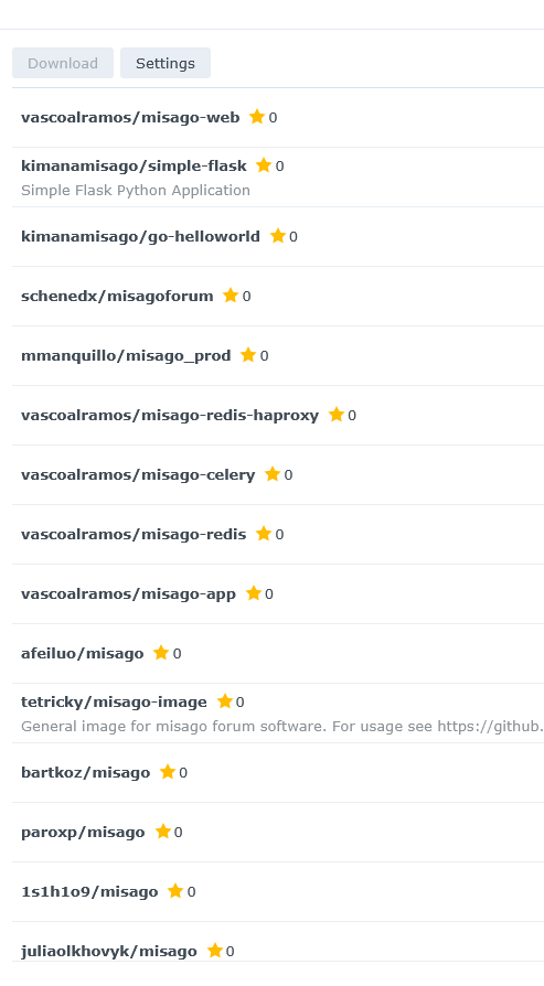 I am new to all this. I have a Synology NAS with 8gb of memory and 32Tb of disk space. I have installed Docker. When I try and add a container and search for "Misago" I get a lot of options. See screenshot.