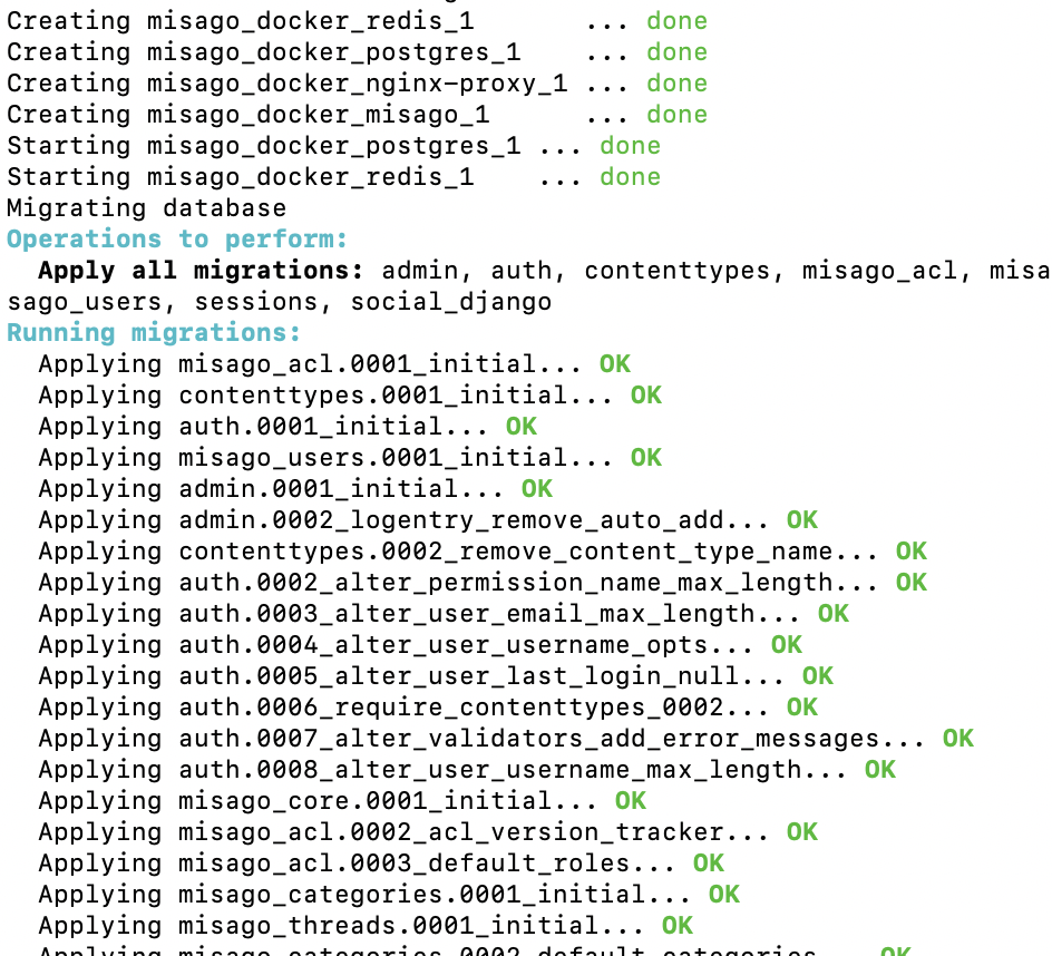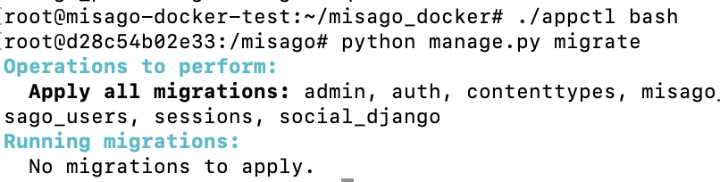 I don't know how possible it would be, but maybe something didn't install right during containers creation but docker just carried on as usual. Then next setup step failed, but you've missed docker volumes and/or config directory contents? Or you've tried to salvage the situation using other means that deleting everything and trying appctl setup again with clean docker and misago_docker directories?