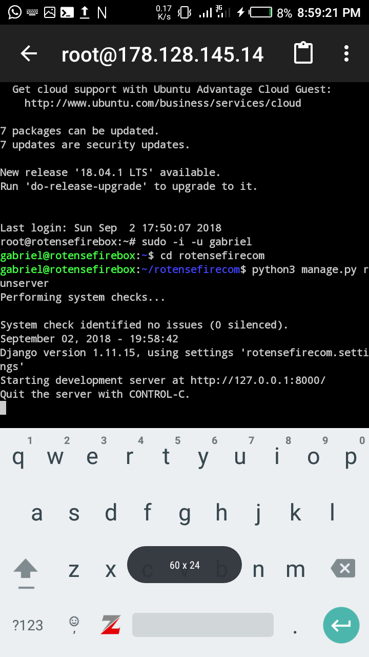 After I entered "python3 manage.py runserver" it shows this BUT site (rotensefire.com) showing "site can't be reached" after this successful Message....please help is needed urgently.