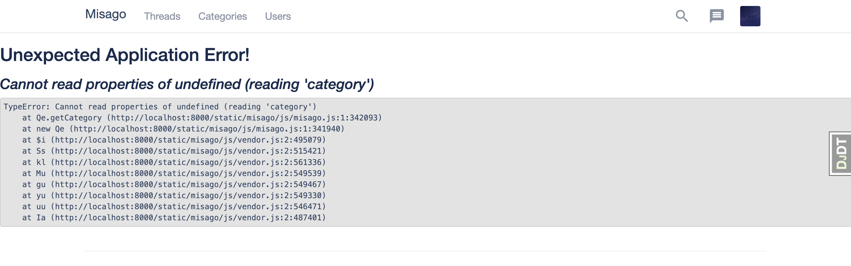 React surely mounted something because server-rendered threads list is gone. But that something failed to render.