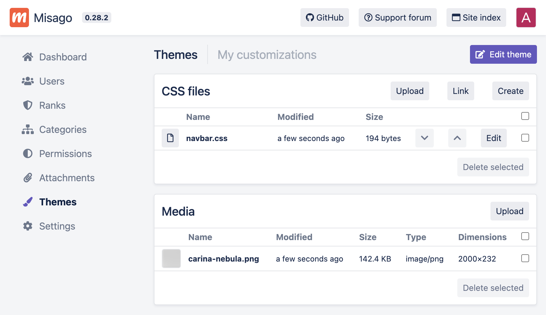 • I can upload a CSS file from my computer - this is useful if you've created stylesheet locally, for example by forking and customizing Misago's default theme's styles.